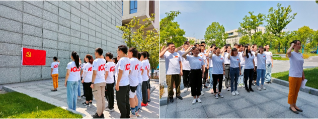 欢声笑语可暂敛,肃穆庄严党旗间。昨日誓词今重现,坚定信心更向前。由肖丽君作为领誓人,在党旗下带领支部同学们重温入党誓词,郑重宣誓。字字声声,铿锵有力,掷地有声,在广场上回旋不息。