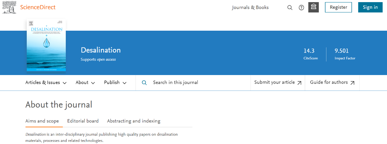 据悉,Desalination于1966年创刊,是脱盐及海水淡化材料、工艺及相关技术方面高质量论文的综合性国际期刊之一,2021年影响因子高达9.501。Desalination每年24期,主要刊载海水淡化材料/工艺/系统/模拟研究、能源消耗及回收、膜脱盐过程、新型膜/材料及其对海水淡化性能的影响、污染及解决措施、卤水资源回收、可再生能源在海水淡化中的应用、热海水淡化过程、电渗析脱盐过程、新颖的海水淡化技术和工艺等学术领域最新研究成果和深度综述,在脱盐、海水淡化领域,具有很高的国际学术声誉。